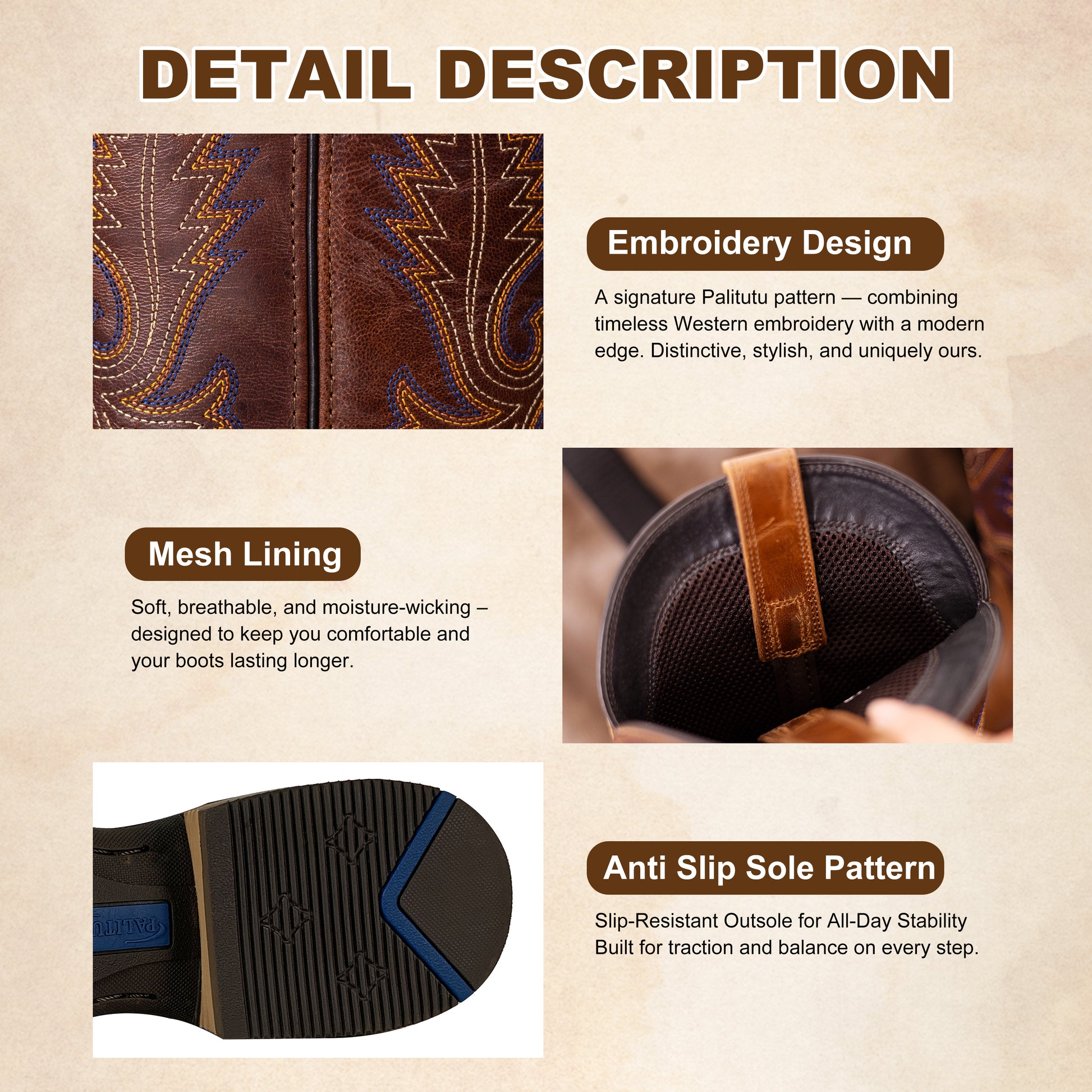 Palitutu PLT103602 Men's Western Cowboy Boots - Full Grain Leather, Square Toe