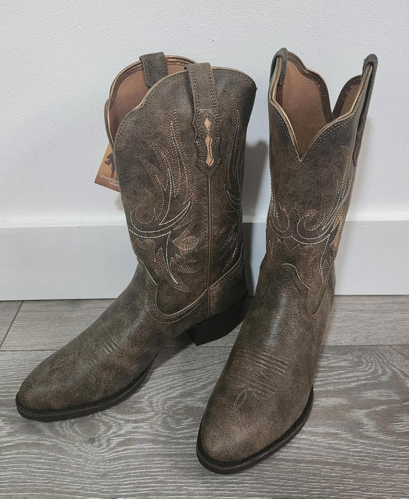 These boots are gorgeous and really well made! The leather feels strong but soft enough that they break in quickly. These were easy to pull on and were roomy and comfortable. They slide up easily to mid-calf height and aren’t tight at all, so can confirm these fit well for wider calves. I ordered in my normal size so can also confirm that they are a true to size fit. The embroidery detail gives them that classic western look. They’re comfortable for all-day wear. I’ve already gotten lots of compliments. I ordered in the grey color which look more like a dusty brown, as seen in the photo.