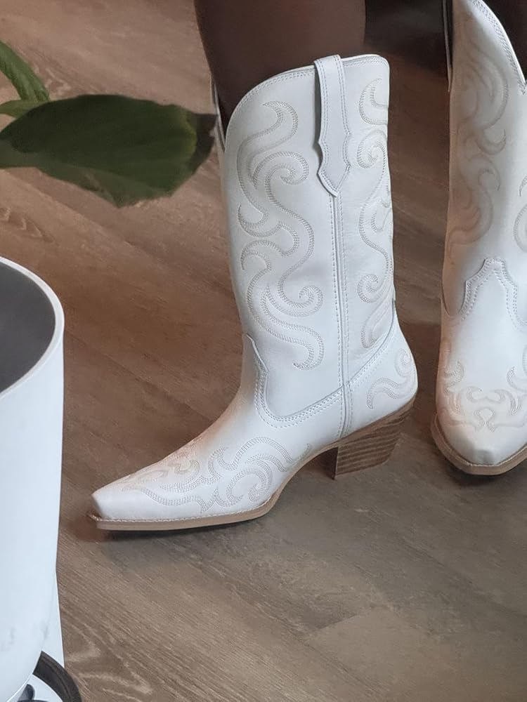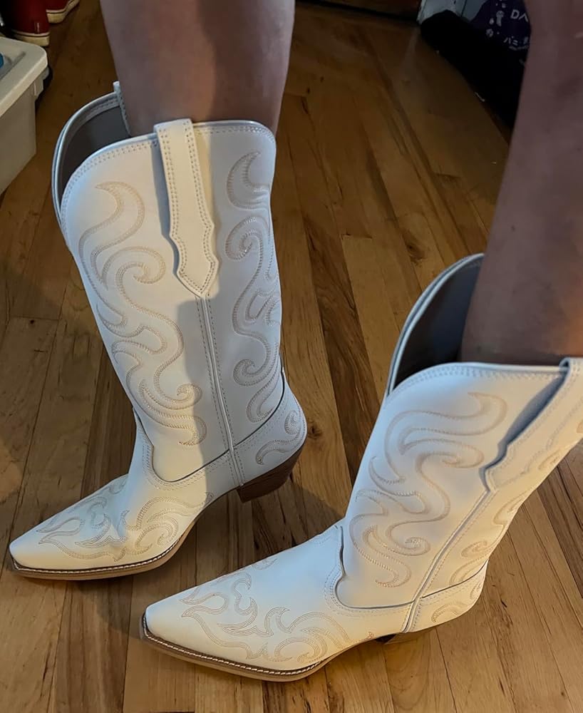 The Palitutu Women's Cowboy Boots are gorgeous and classy with the unique western pattern embroidery. Since they are made with real leather, they should hold up for many years.Besides being beautiful and well-made, these boots are also comfortable to wear with their low heels and nonslip rubber soles. The pointed toe gives them more of a feminine look than square toe cowboy boots. They are also easy to pull on/off with the pull tabs.Although I have a narrow foot, I ordered my regular shoe size (9) and they fit well. The white color goes with almost everything in my wardrobe and they look great with dresses, skirts, and jeans.Overall, I’m happy with these cowboy boots and have ordered two more of these boots from this company in different colors.