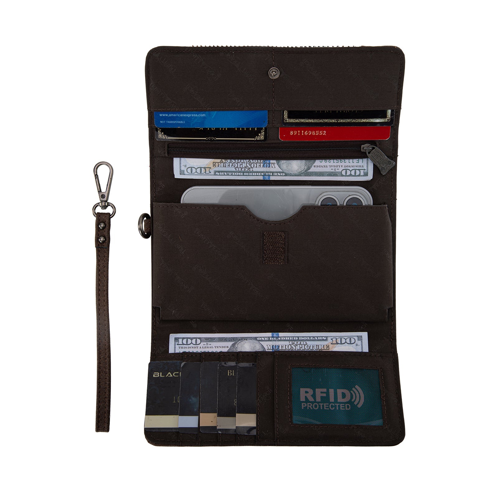 - Single removable strap to convert the wallet into a wristlet