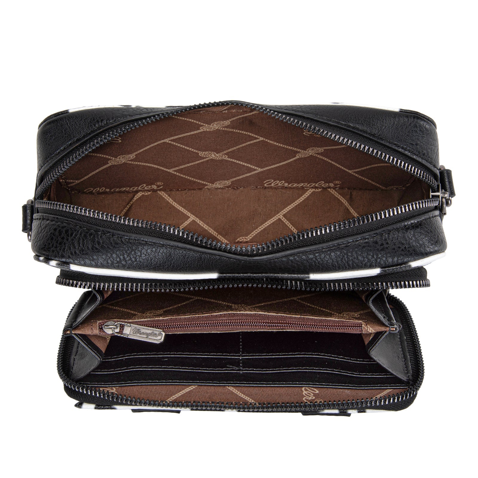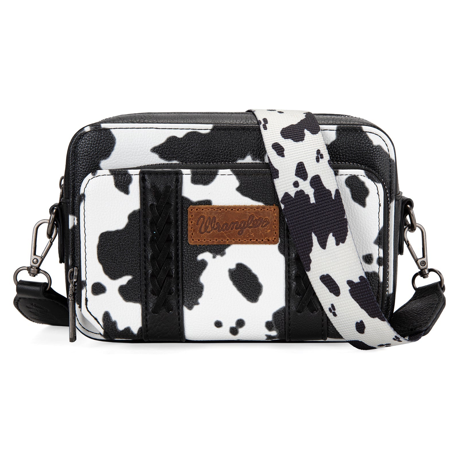 WG133-3003 Wrangler Cow Print Crossbody Purse With Wallet Compartment - Black
