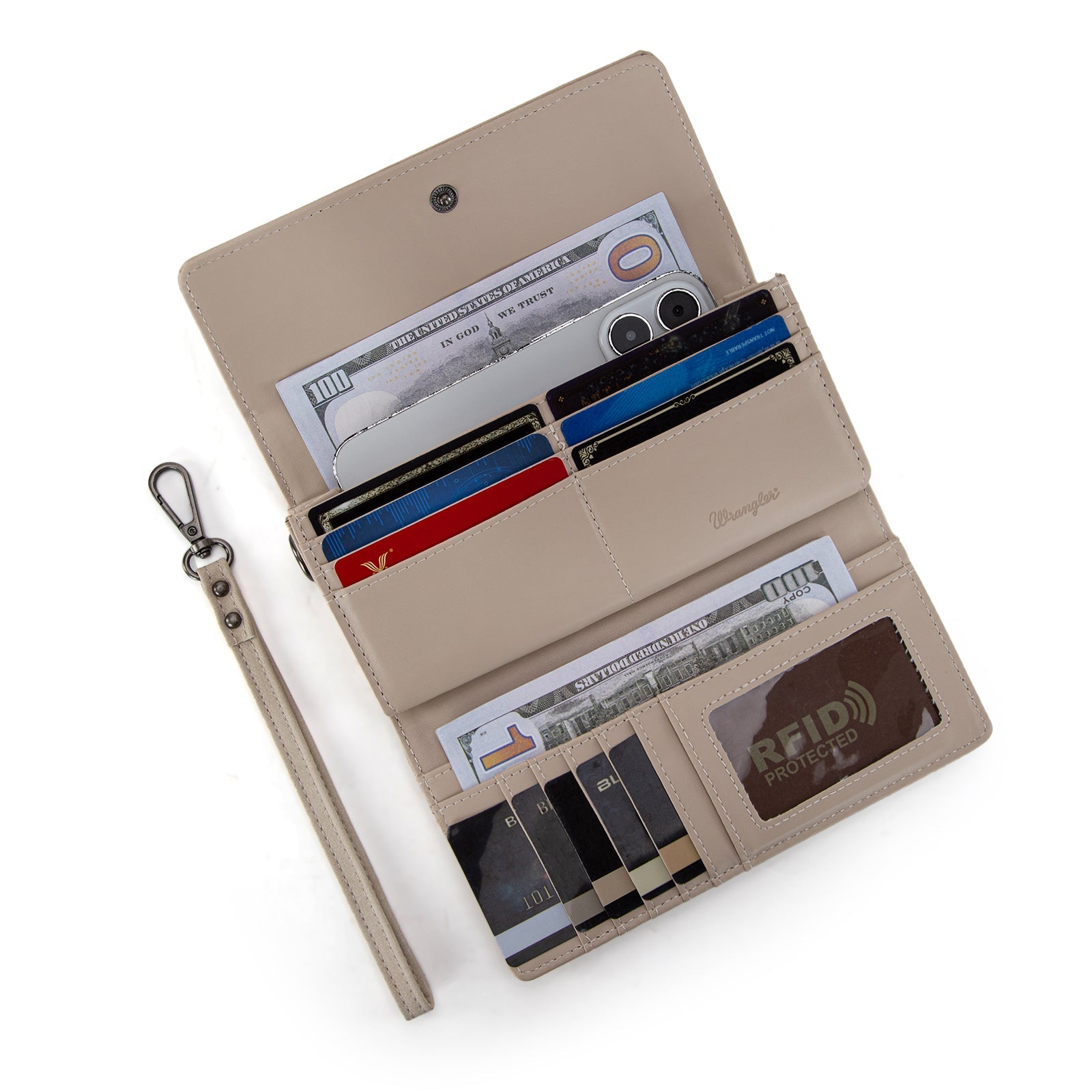 - Single removable strap to convert the wallet into a wristlet