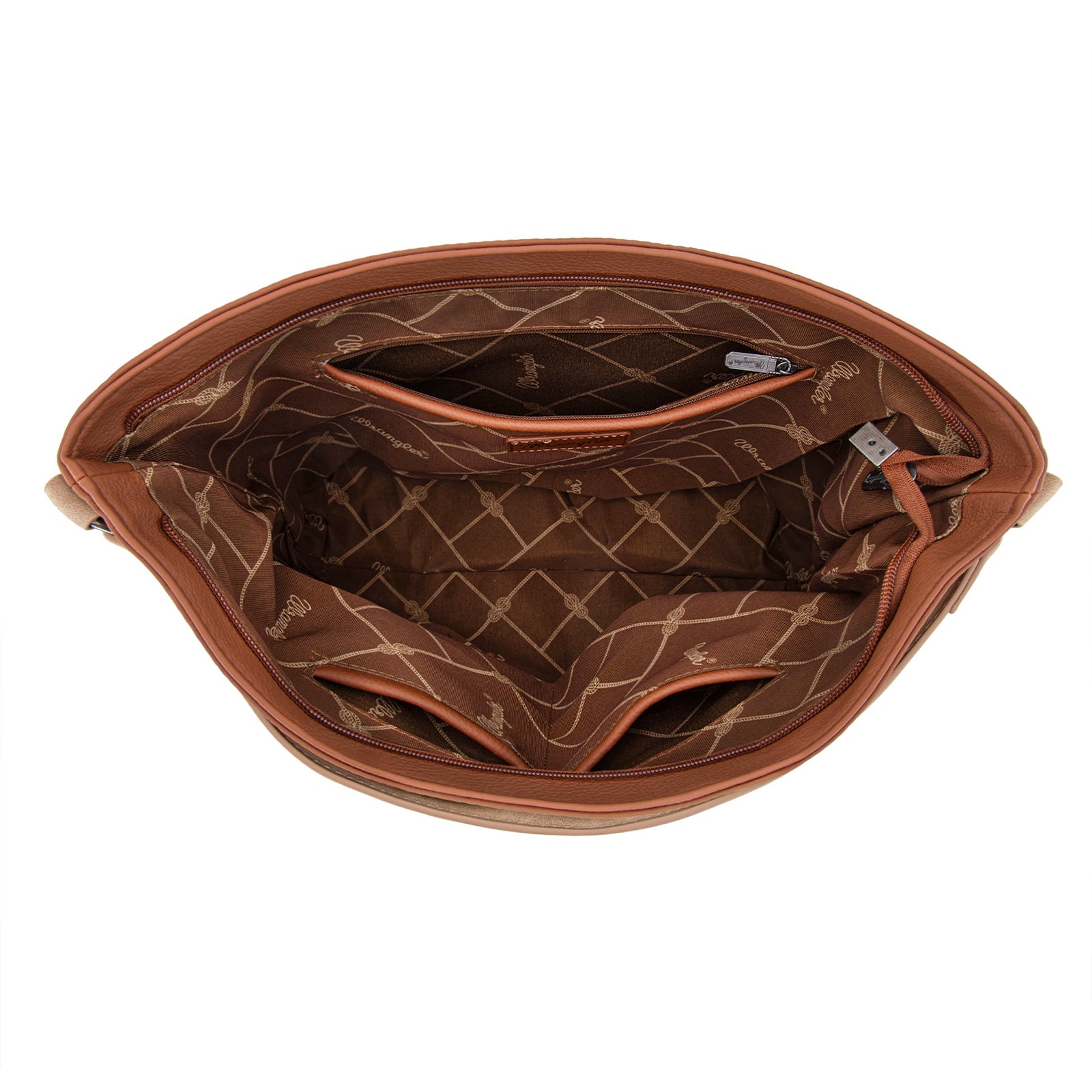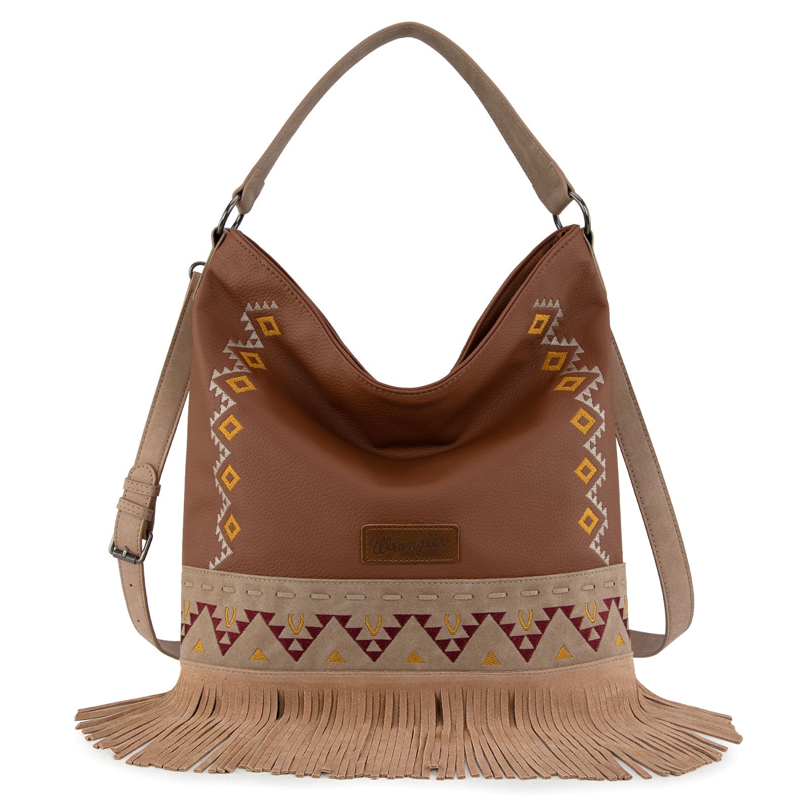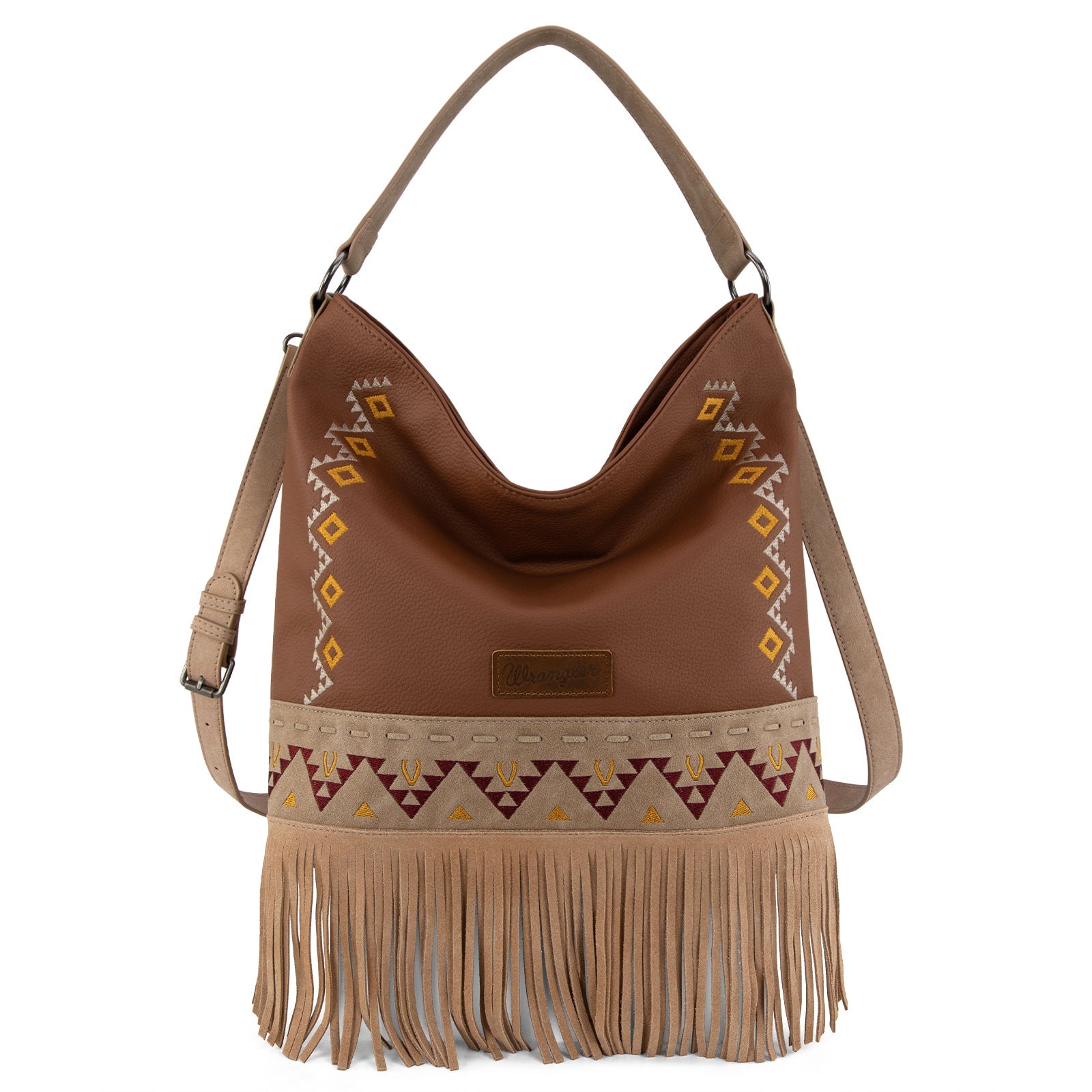 WG233-2001 Wrangler Aztec Embroidered Fringe Large Hobo/Crossbody Bag- Light Brown