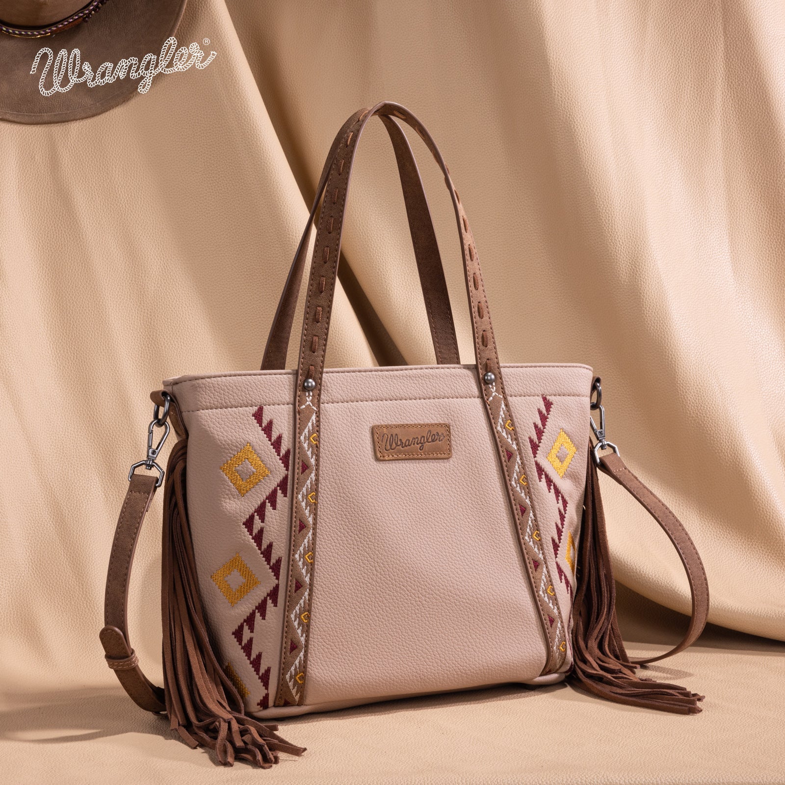 WG233-2009 Wrangler Aztec Embroidered Tote/Crossbody Bag- Tan